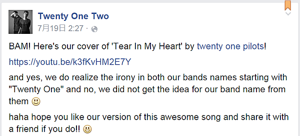 他們在最新一首翻唱Twenty One Pilots的Tear In My Heart時也解釋過說他們樂團名稱的靈感來源並不是Twenty One Pilots這個樂團,