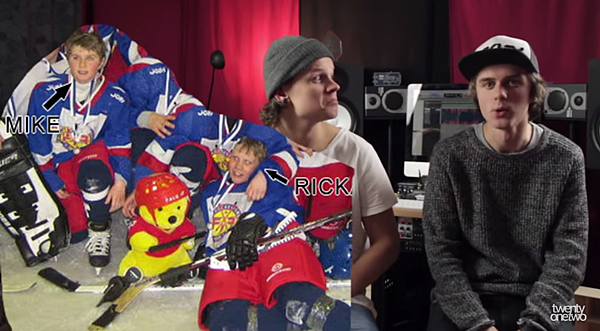被問到兩人怎麼認識的,他們說是小時候打冰上曲棍球,放了一張照片,還特別用手比個高度強調是很小的時候